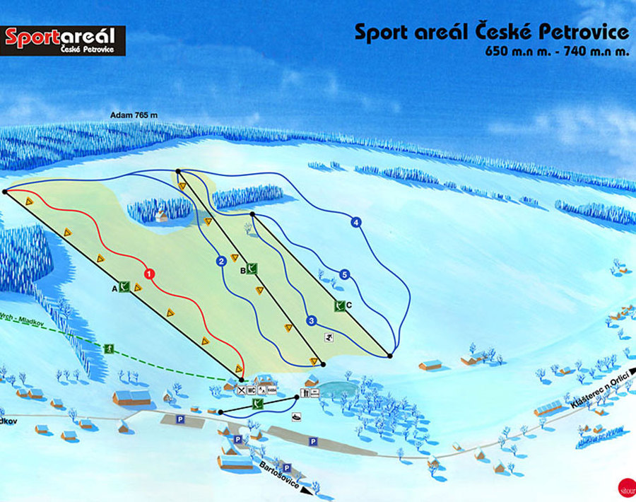 Lyžařský areál v nadmořské výšce 740-650 m.n. se nachází v samotném centru obce České Petrovice v Orlických horách,přibližně 4 Km východně od Klášterce na Orlicí. Pro areál je prioritou rodinné prostředí a zázemí .Je ideální především pro rodiny s dětmi, začátečníky a rekreační lyžaře. V kategorizaci lyžařských středisek byl oceněn třemi hvězdami poskytovaných služeb. Díky rozsáhlému systému technického zasněžování a orientací sjezdovek k severu umožňuje středisko kvalitní lyžování přibližně od poloviny prosince do konce března. V celém areálu se můžete pohybovat za jednotné jízdné díky odbavovacímu systému, který umožňuje zakoupení jednotlivých, bodových ,časových ale i skupinových jízdenek. U dolní ch stanic vleků je parkoviště přibližně pro 80-120 aut a je zdarma.Areál má celkovou přepravní kapacitu 2150 osob za hodinu což je předpoklad pro nulovou čekací dobu.Sjezdovky jsou velmi široké, místy až 100 m s dostatkem prostoru pro každého lyžaře a nevedou lesem.Každý den jsou strojově upravovány a zaručují velmi dobré podmínky pro rekreační lyžaře. Areál disponuje čtyřmi sjezdovkami o celková délce 2 km.Tři sjezdovky jsou opatřeny technickým zasněžováním a dvě mají osvětlení pro večerní lyžování.Na jedné ze sjezdovek je umístěn snowpark s překážkami.Pro nejmenší lyžaře je zde dětské hřiště s pomůckami pro výuku. Hřiště je osazeno dvěma dětskými provazovými vleky a opatřeno také technickým zasněžováním. Na tomto hřišti i sjezdovkách si můžete zajistit výuku v lyžařské a snowboardové škole, která má zde také své zázemí.