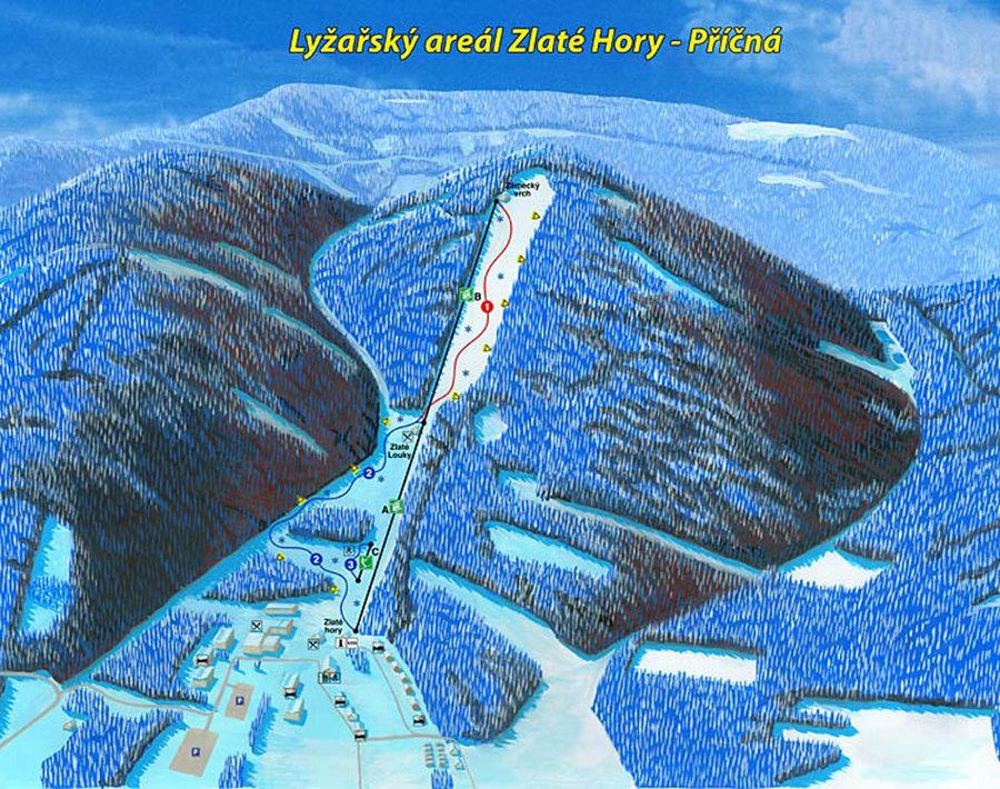 Lyžařský areál Příčná se nachází ve Zlatých Horách na severní patě Příčné hory (975 m.n.), 3 km od hranic s Polskou republikou a v těsné blízkosti komunikace II. třídy Jeseník-Zlaté Hory-Krnov-Opava-Ostrava. Parkování je bezplatné bezprostředně u nástupní stanice čtyřsedačkové lanové dráhy. Lanová dráha Doppelmayr je vybavena rozběhovým pásem a její přepravní kapacita je 2 400 osob/hodinu. Povrch sjezdovky je zasněžován a pravidelně upravován rolbou. Díky tomuto modernímu vybavení nemusí návštěvníci čekat v dlouhých frontách, mohou si řádně zalyžovat. Ve skiareálu je k dispozici půjčovna veškerých lyžařských potřeb a lyžařská škola firmy SUN SKI Jeseník. Pro nejmenší je připraven dětský svah u nástupní stanice s dětským vlekem. K dispozici je občerstvení a sociální zázemí, také v těsné blízkosti nástupní stanice lanové dráhy.