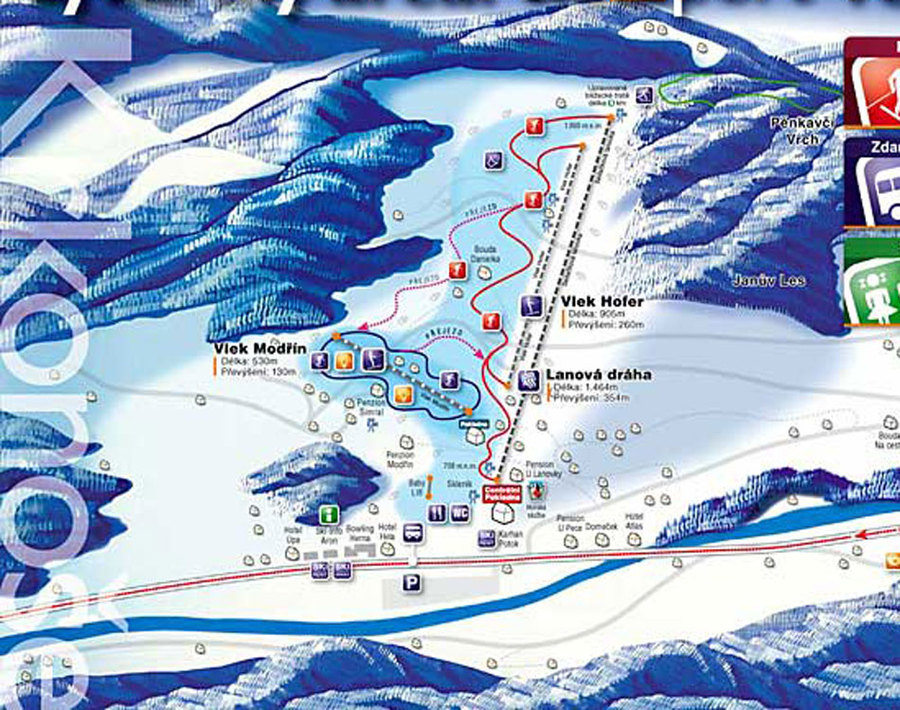 Pro noční lyžování je osvětlena sjezdovka u vleku Modřín. Sjezdové tratě jsou po celé své délce rolbovány a uměle zasněžovány. Díky terénním úpravám se výrazně zlepšila jejich sjízdnost. V areálu můžete využít služeb nejen dvou půjčoven lyží, ski servisu, lyžařské školy a dětského vleku, ale i nově otevřeného Snow-Parku s pěti kvalitními překážkami pro snowboardaře, přístupného z vleku Modřín, v prostorách dolní stanice pak občerstvení a WC.